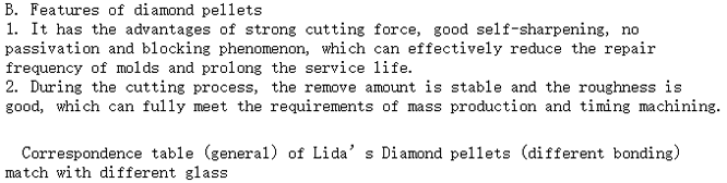 ?? 3. Even the different type glass with same abrasion resistance, their feature will be various in cold processing, please contact our technicians for advice before you choose our diamond pellets.