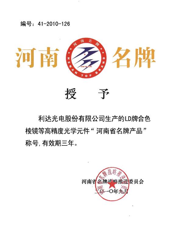 ??????? 近日,公司生產的LD牌合色棱鏡等高精度光學元件榮獲“河南省名牌產品”的稱號,這是繼2009年公司榮獲河南省優(yōu)質產品之后取得的又一榮譽。
