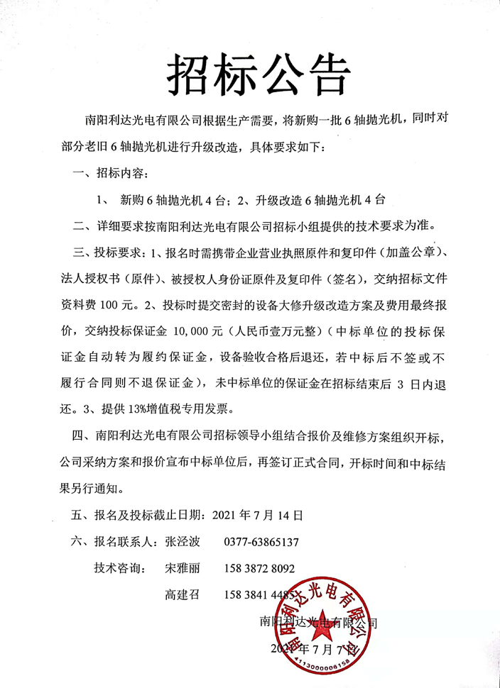 棱鏡事業(yè)部新購及升級改造6軸拋光機招標